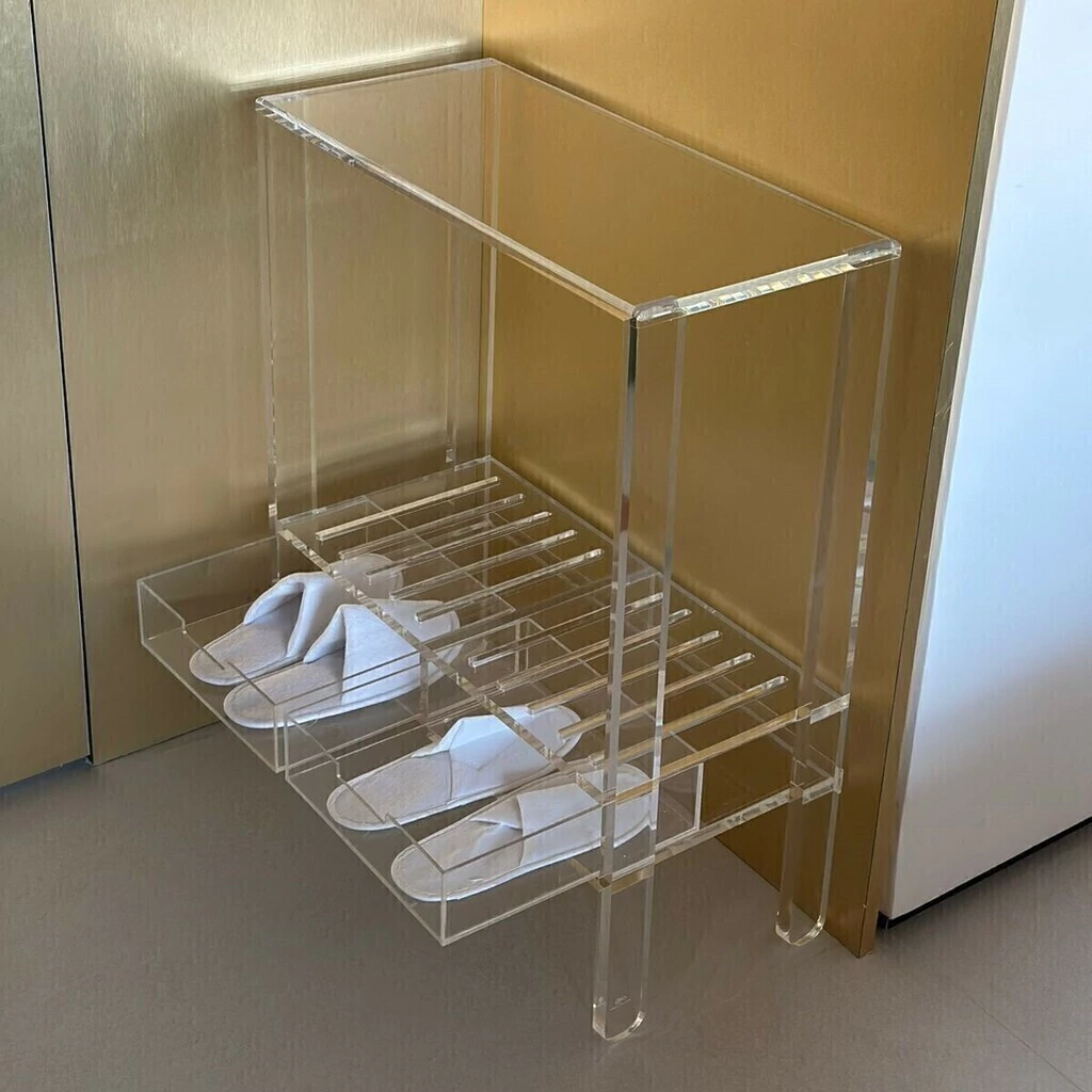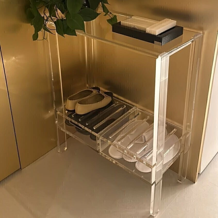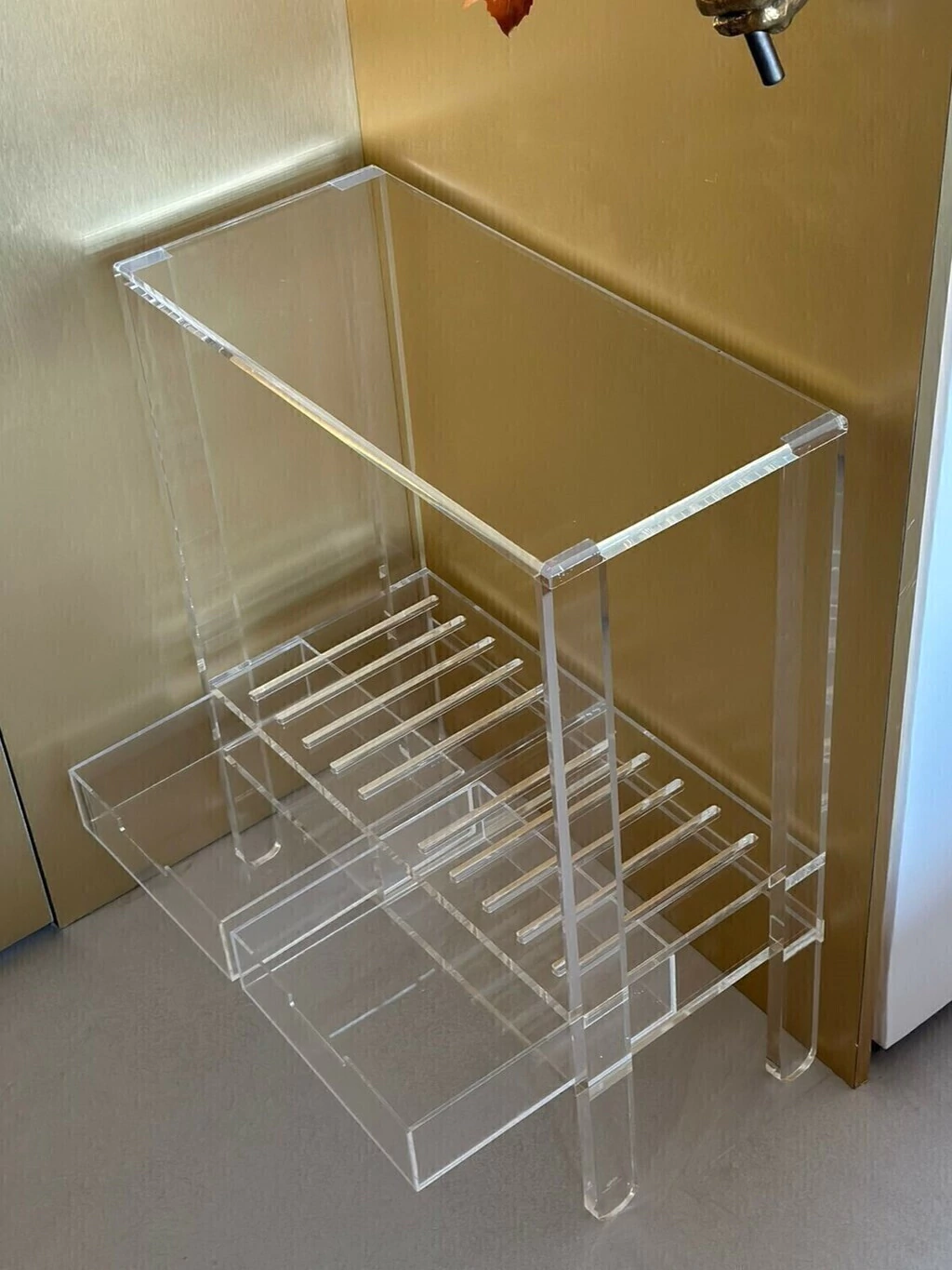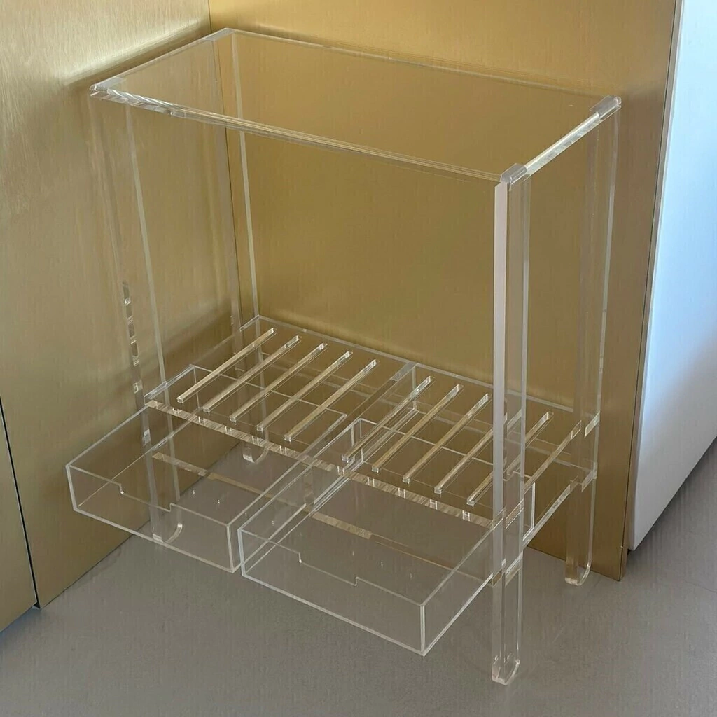 Sapateira/Aparador desenvolvida pela arquiteta Dudi Duarte com exclusividade para a Acrílico Decora. Produzido em acrílico maciço, pés arredondados e ideal para compor o hall. Possui 2 gavetas e prateleira ripada.