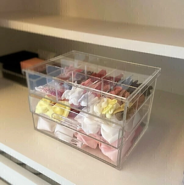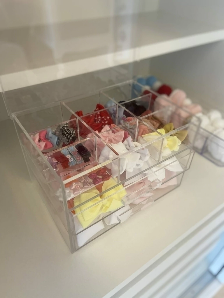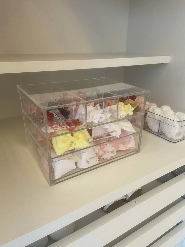 Descrição A Caixa para Laços é a solução perfeita para organizar seus acessórios com sofisticação. Produzida em acrílico transparente de alta qualidade, apresenta três andares: duas gavetas e uma bandeja com tampa articulada, garantindo praticidade e proteção para seus itens.