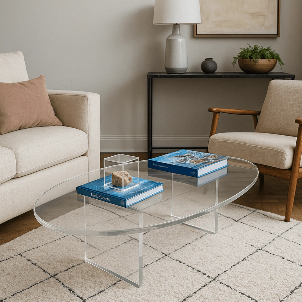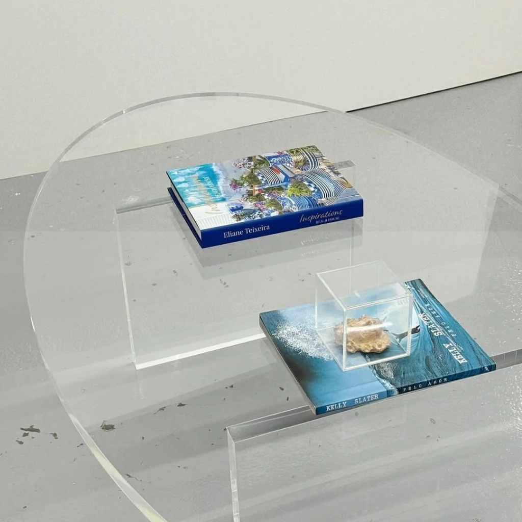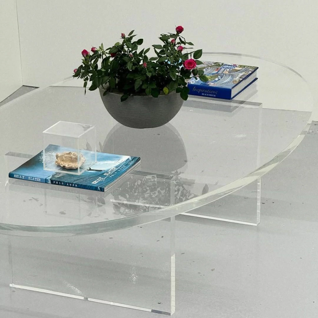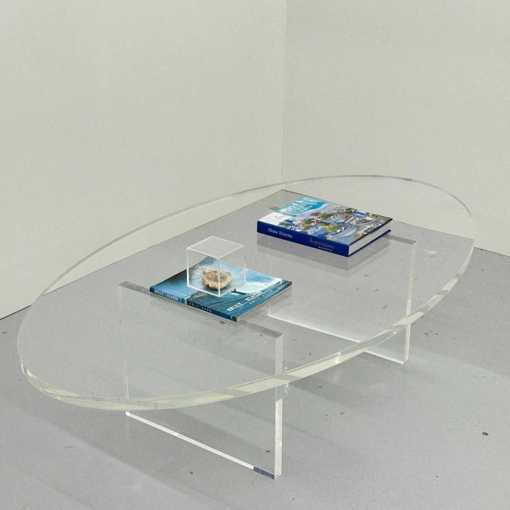 A Mesa de Centro Noel, uma peça sofisticada que traz um toque de elegância e modernidade para qualquer ambiente. Seu tampo oval é produzido em acrílico cristal maciço de 30 mm, oferecendo transparência impecável e alta resistência, ideal para quem valoriza qualidade e design.